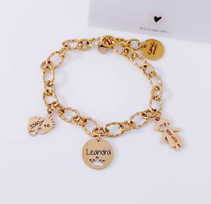 Pulsera y charms de acero inoxidable con largura suficiente para adaptar a la muñeca.